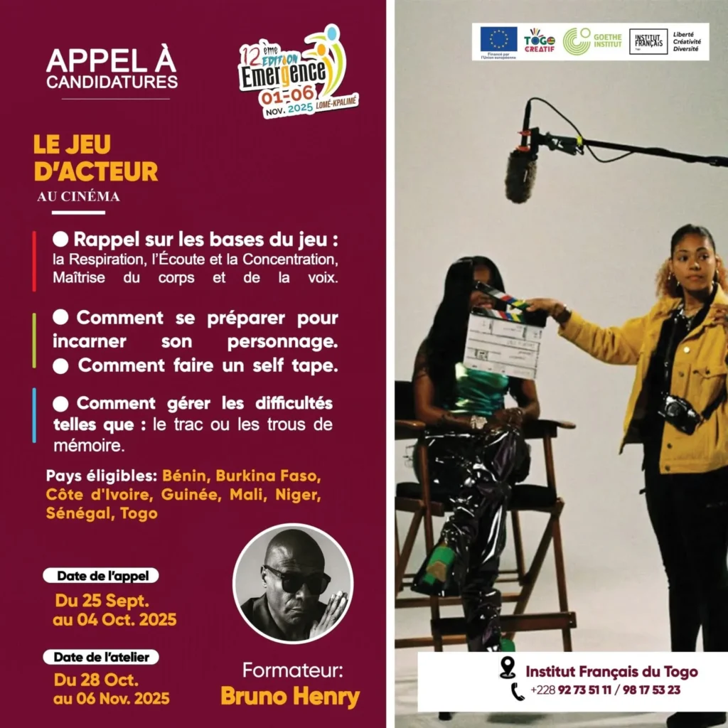 Dans le cadre de la 12ᵉ édition d’Emergence Films Festival, en partenariat avec le programme européen Togo Créatif, un atelier de formation sur le jeu d’acteur au cinéma sera organisé pour la troisième année consécutive.