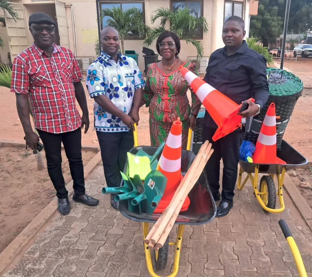 Originaire de la commune, SANDJIE Komivi Djifa a posé un acte significatif en offrant un ensemble d’équipements indispensables aux opérations de salubrité. Ce lot comprend notamment trois brouettes pour le transport des déchets, cinq pelles destinées aux travaux de curage, cinq balais de voirie pour l’entretien des espaces publics, dix gilets de haute visibilité pour sécuriser les agents, ainsi que cinq cônes de signalisation pour baliser les zones d’intervention. À travers ce geste, le donateur entend soutenir les actions d’assainissement et faciliter le travail quotidien des équipes sur le terrain.