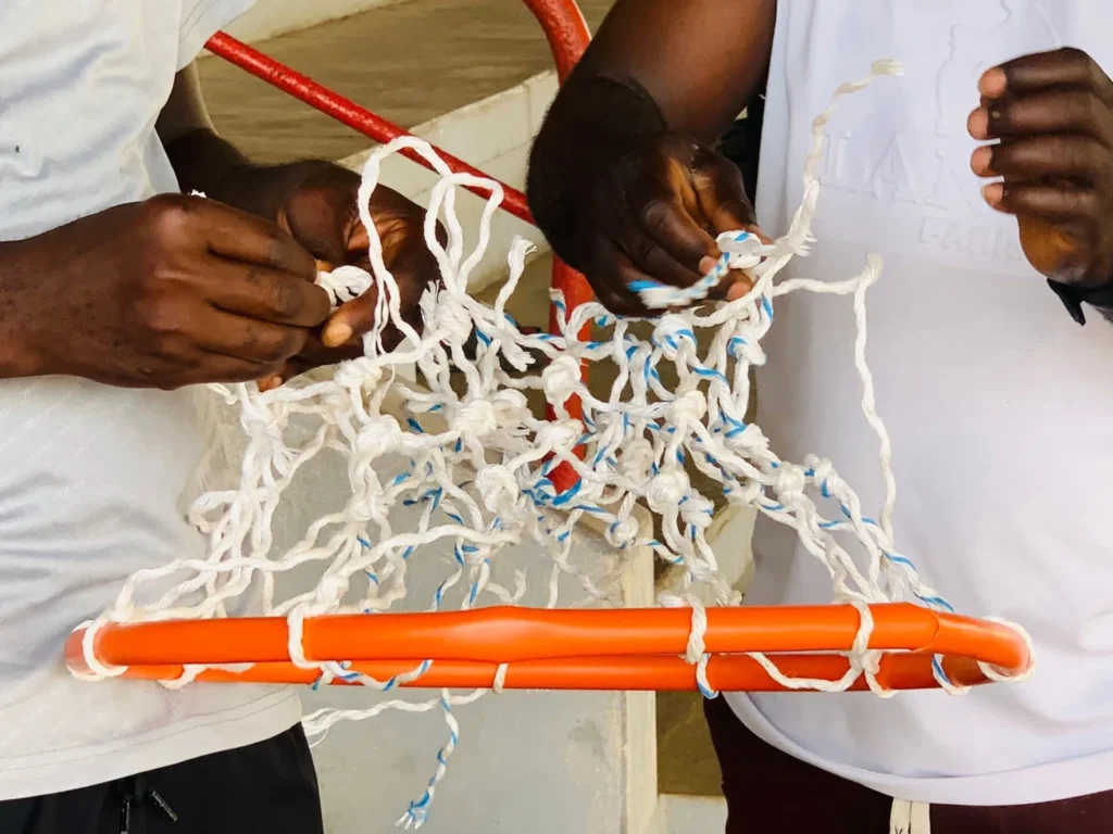 Au-delà des exercices techniques sur le terrain, les participants ont bénéficié d’ateliers pratiques, notamment sur le tissage de filets de basketball et de football. Les formateurs leur ont présenté diverses techniques permettant de confectionner et de réparer des filets destinés au basketball, au football, au volley-ball ou même à un usage domestique. Une compétence à la fois utile et innovante.
