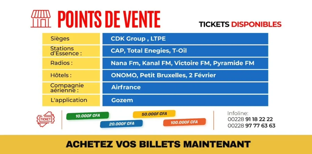 Les billets sont disponibles au siège de CDK Group, à la Ligue Togolaise pour la Protection de l’Enfance (LTPE), dans les stations-service CAP, TotalEnergies et T-Oil, ainsi que dans plusieurs médias et établissements partenaires, notamment Nana FM, Victoire FM, Pyramide FM, les hôtels Onomo, Petit Bruxelles, 2 Février, sans oublier la compagnie aérienne Air France.