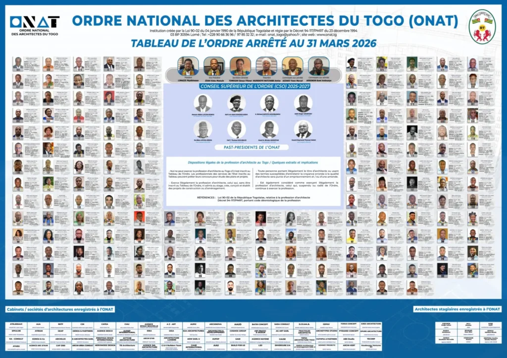 Le Conseil Supérieur de l’Ordre National des Architectes du Togo (CSO-ONAT) a officiellement rendu public le Tableau de l’Ordre au titre de l’année 2026.