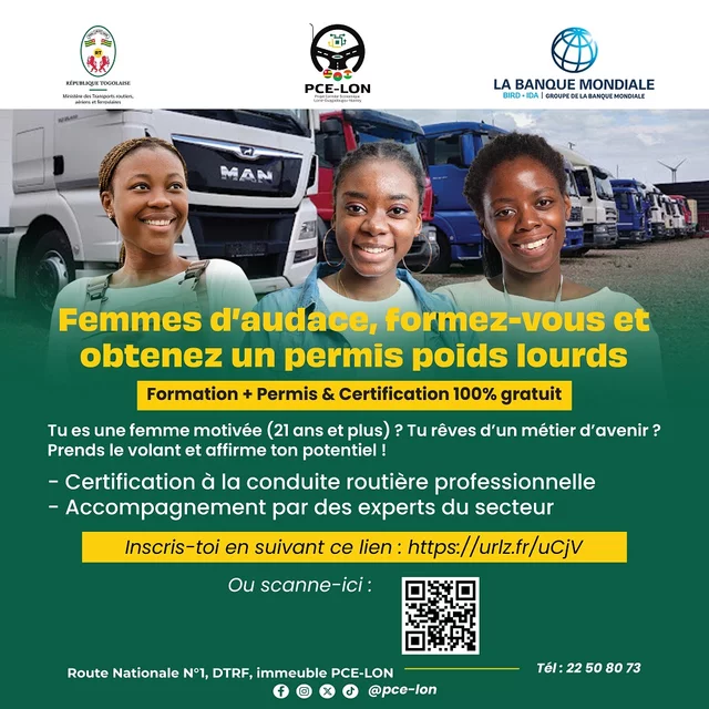 Dans ce cadre, 240 femmes togolaises âgées de 21 ans et plus auront l’opportunité de suivre une formation gratuite en conduite de poids lourds. L’objectif est de favoriser leur insertion professionnelle dans un domaine historiquement dominé par les hommes et de promouvoir une meilleure inclusion économique des femmes dans le secteur du transport routier.